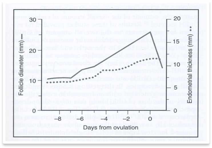 月経後から1日に約1mmずつ厚くなり、7mm以上で受精可能、排卵直前には10mm以上になることが多いとされています。