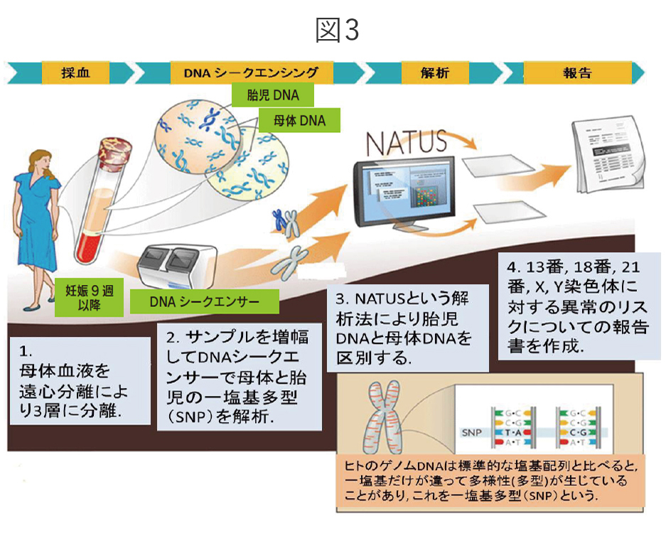 採血によってお母さんから血液を約10ml採取して、血液を検査会社に送付して解析します。解析の詳しい流れは下記の通りになります(図3)。