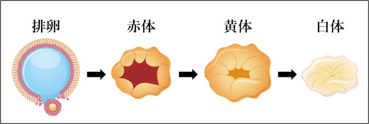 排卵後は、卵胞内の囲卵腔に流入した出血が顆粒膜細胞や莢膜細胞と混じり合い、赤体を形成したのち黄体から白体へと変化していきます(図2)。