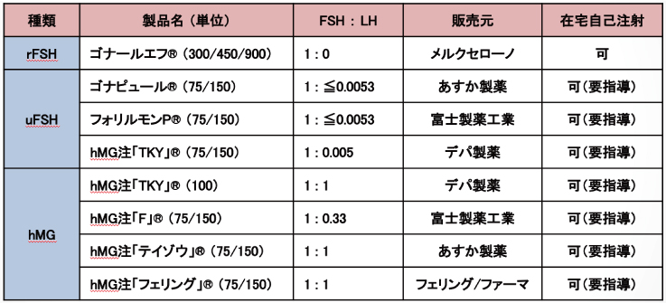 培養細胞から作られるrFSH製剤と、閉経後女性の尿から作られるuFSH製剤/hMG製剤の2つに大別されます。