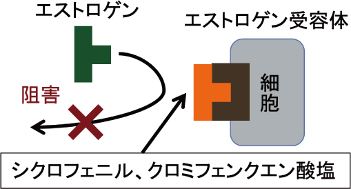 選択的エストロゲン受容体モジュレーター(=SERM:Selective Estrogen Receptor Modulators)とも言われ、卵巣ホルモンであるエストロゲンが、脳の視床下部に存在する受容体(結合した物質によるシグナルを細胞内の下流物質へと伝達する蛋白質複合体)と結合することを競合的に阻害します(図3)。